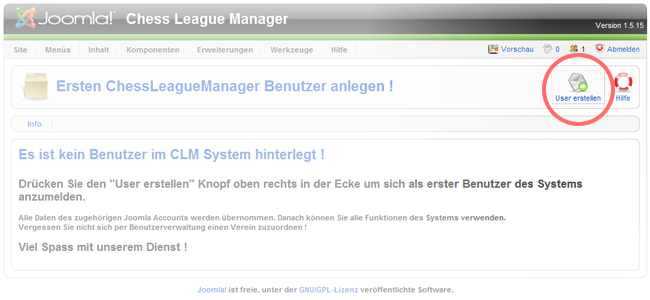 Beim ersten Start des CLM sehen Sie einen Bildschirm, der nur ein eniziges Mal gezeigt wird. Hier drücken Sie auf "User anlegen" um sich als erster Administrator des Systems anzumelden :
