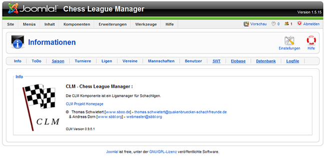 Wenn Sie Administrator sind sehen Sie die Hauptmenüelemente Info, ToDo, Saisons, Ligen, Vereine, Mannschaften, Benutzer, SWT, Elobase, Datenbank und Logfile. Die unterstrichenen Menüelemente und Knöpfe sind ausschließlich für Administratoren, d.h. Benutzer Admin, DV Referent, DWZ Referent und Spielleiter zugänglich :