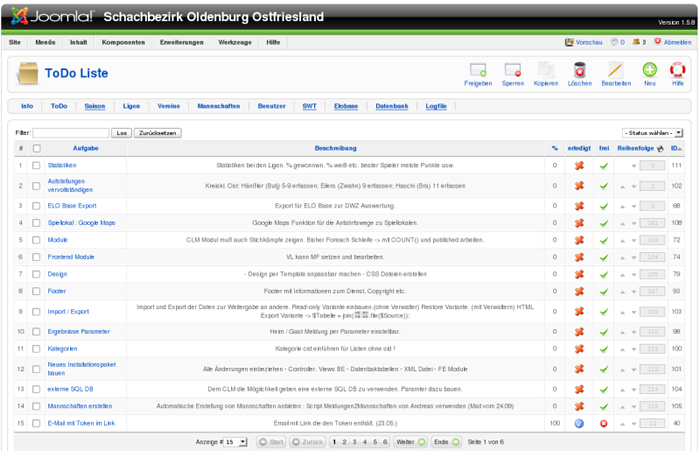 Das Dropdown Menü "Status wählen" auf der rechten Seite erlaubt es nach Elementen zu sortieren. In diesem Fall nach "veröffentlicht" (published) bzw. "unveröffentlicht" (unpublished). Elemente die in der Spalte "Frei" (wie Freigabe) einen grünen Haken haben sind Freigegeben, Elemente mit einem roten Kreuz sind zurückgezogene Elemente. Dieses Konzept wird später an Bedeutung gewinnen weil Sie damit z.B. Ligen zurückziehen können und diese dann ohne Zeitverzögerung nicht mehr im Frontendbereich zu sehen sind. Weitere Erklärungen folgen unten im Text.
