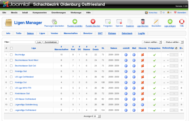 - "erstellt" gibt an ob die Ligarunden in der Datenbank erstellt wurden, was normalerweise beim Erstellen der Liga geschieht. Der Administrator kann aber auch manuell darauf Einfluß nehmen. Ein blauer Haken heißt erstellt, ein rotes Kreuz bedeutet nicht erstellt