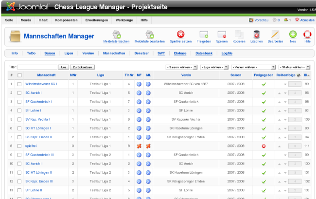 - "Freigegeben", eine gesperrte Mannschaft kann im Frontend nicht angeklickt werden. (siehe auch Besonderheiten). "Spielfrei" sollte immer auf unveröffentlicht gestellt werden.