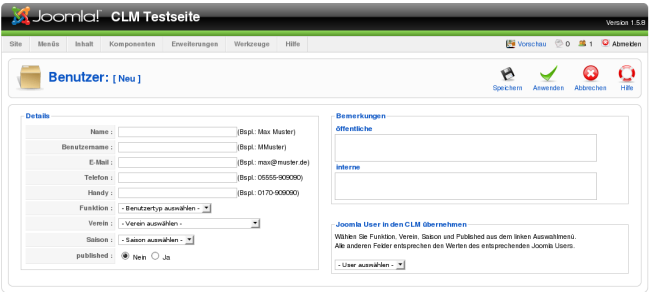 Wenn Sie bestehnde Nutzer des Joomla Systems in den CLM übernehmen wollen, wählen Sie "Neu" dort ist eine Option zur Übernahme vorhanden.