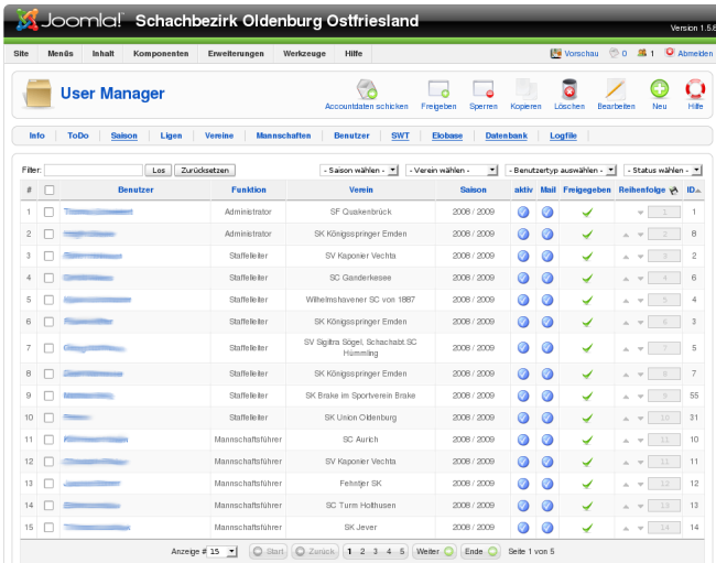 In der kommenden Version des CLM werden wir eine automatische Übernahme der Nutzer in eine neue Saison anbieten. - "aktiv" zeigt ein blauen Haken wenn der Nutzer sich im Joomla bzw. CLM angemeldet hat, ansonsten sehen sie ein rotes Kreuz.
