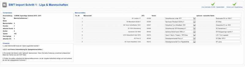 Mein Vorschlag für den SWT-Import ist übrigens bevor die Mannschaftsdaten bestätigt werden, erst noch die Ligadaten zu bestätigen. Wenn man dort den Namen und die Punktvergabe für (Sieg, Remis, Niederlage, Antritt) notfalls manuell ändern kann, würden sich einige dieser Probleme von selbst lösen.