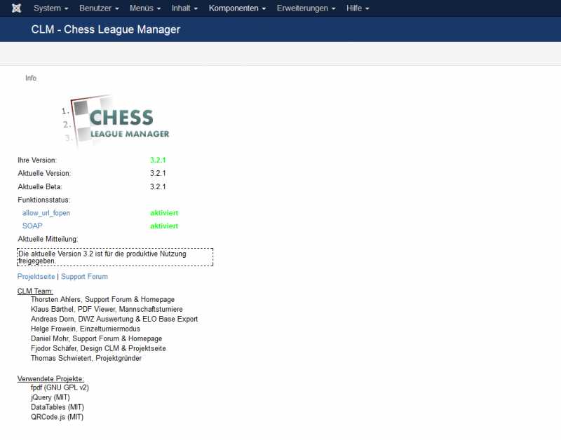 ich habe gerade die Migration von Joomla 2.5.28 auf 3.4.3 gemacht. Dabei habe ich die Paketinstallation benutzt und habe 3.0.1 als Zwischenstufe installiert, weil ein direktes Update auf 3.4.3 nicht geklappt hat. Vor dem Upgrade habe ich den CLM deinstalliert. Die Seite läuft nun problemlos auf 3.4.3(trotz kurzer Fehlermeldung, siehe unten), den CLM habe ich neu installiert ohne Fehlermeldung (bei der Zwischenstufe 3.0.1 ließ er sich installieren, aber nicht öffnen). Nun bekomme ich aber im Backend unter "Erweiterungen-ChessLeagueManager" nur das Infofenster, was normalerweise am rechten Rand ist. (siehe Anlage) Wenn ich über phpmyadmin die Datenbankeinträge checke, sind aber alle vergangenen Saisons da und auch alle User sind eingetragen unter [präfix]_clm_users. Ebenfalls wurden alls Joomla-User übernommen. Ich kann die vergangene Saison über das minitable-Modul im Frontend darstellen.