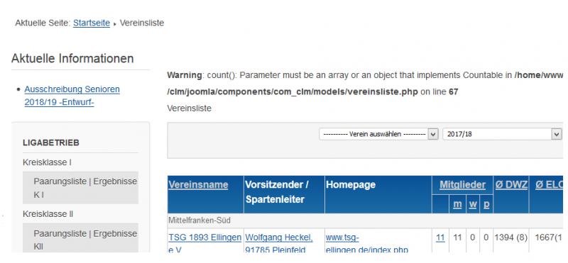 - Fehlerhinweis Vereinsliste bei PHP 7.2.8