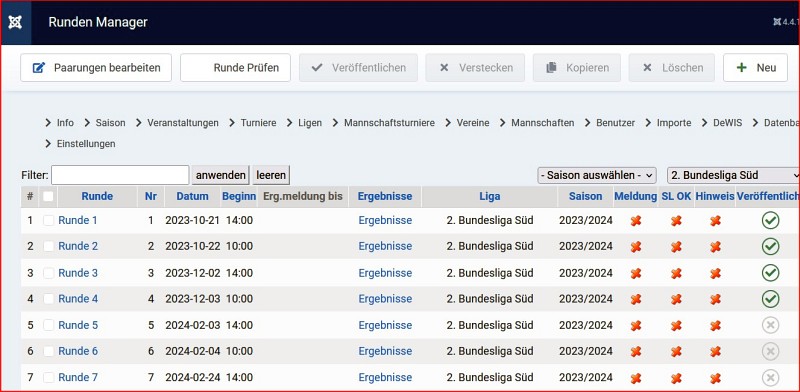 Wenn ich die aktuelle 4.Runde inkl. der Auslosung importiere, sehe ich nur noch die 4 Runden, für die es eine Auslosung gibt. Die anderen Runden sind weder sicht- noch aktivierbar.