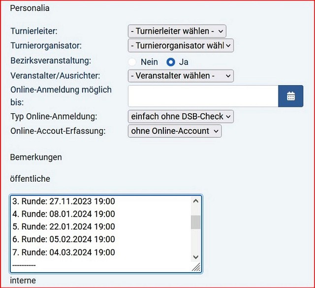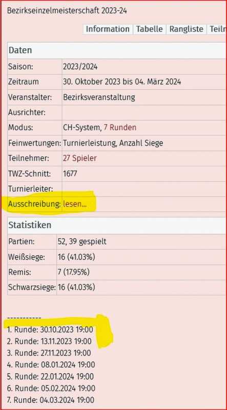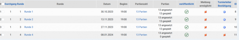 Weiterhin wird natürlich die Information übertragen, wieviele Runden das Turnier hat, und ggf. auch die Termine der Runden, falls diese in der swt-Datei stehen. Ebenso die Paarungen auch in den weiteren Runden, so diese bereits in der swt-Datei vorliegen. Wie es z.B. bei einem Vollrundenturnier der Fall ist....