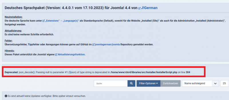 Als danach Joomla auf 4.4.0 upgedated wurde (auch das deutsche Sprachpaket), gab es bei dem update selbst keine deprecated-messages.