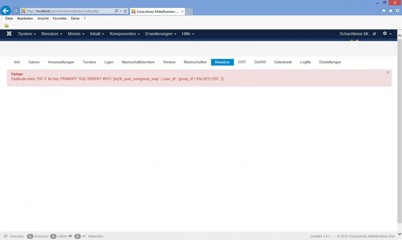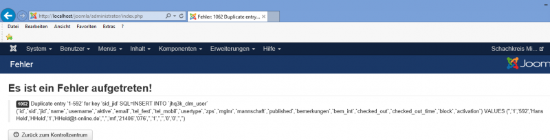 Das Löschen von Benutzern in Joomla + CLM bringt keine Besserung. Bei der Neuanlage des Benutzers (als Mannschaftsführer) kommt die Fehlermeldung