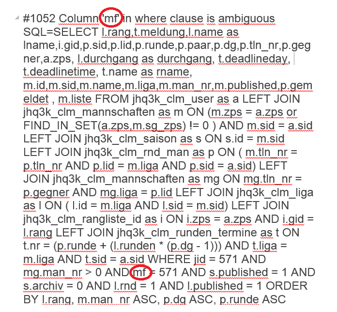 #1052 Column 'mf' in where clause is ambiguous SQL=SELECT l.rang,t.meldung,l.name as lname,i.gid,p.sid,p.lid,p.runde,p.paar,p.dg,p.tln_nr,p.gegner,a.zps, l.durchgang as durchgang, t.deadlineday, t.deadlinetime, t.name as rname, m.id,m.sid,m.name,m.liga,m.man_nr,m.published,p.gemeldet , m.liste FROM jhq3k_clm_user as a LEFT JOIN jhq3k_clm_mannschaften as m ON (m.zps = a.zps or FIND_IN_SET(a.zps,m.sg_zps) != 0 ) AND m.sid = a.sid LEFT JOIN jhq3k_clm_saison as s ON s.id = m.sid LEFT JOIN jhq3k_clm_rnd_man as p ON ( m.tln_nr = p.tln_nr AND p.lid = m.liga AND p.sid = a.sid) LEFT JOIN jhq3k_clm_mannschaften as mg ON mg.tln_nr = p.gegner AND mg.liga = p.lid LEFT JOIN jhq3k_clm_liga as l ON ( l.id = m.liga AND l.sid = m.sid) LEFT JOIN jhq3k_clm_rangliste_id as i ON i.zps = a.zps AND i.gid = l.rang LEFT JOIN jhq3k_clm_runden_termine as t ON t.nr = (p.runde + (l.runden * (p.dg - 1))) AND t.liga = m.liga AND t.sid = a.sid WHERE jid = 571 AND mg.man_nr > 0 AND mf = 571 AND s.published = 1 AND s.archiv = 0 AND l.rnd = 1 AND l.published = 1 ORDER BY l.rang, m.man_nr ASC, p.dg ASC, p.runde ASC