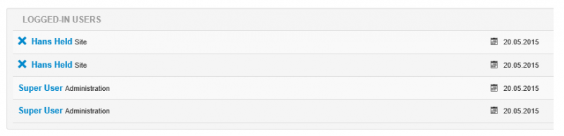 - logins beenden: der Administrator kann jeden anderen Login beenden. Egal ob der gerade aktiv ist, oder "schläft". Dazu gibt es in der Liste der eingeloggten User die "Kreuzel" vor Hans Held. ein Klick darauf (als administrator)...