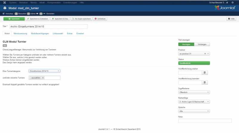 Als Archiv für Einzelturniere verwende ich ebenfalls das CLM Modul Turnier. Hier gibt es aber nun das Problem, dass man nur eine Kategorie pro Modul auswählen kann.