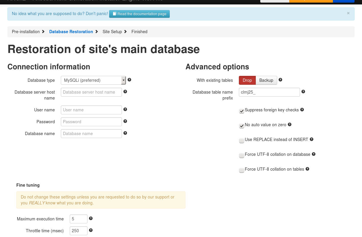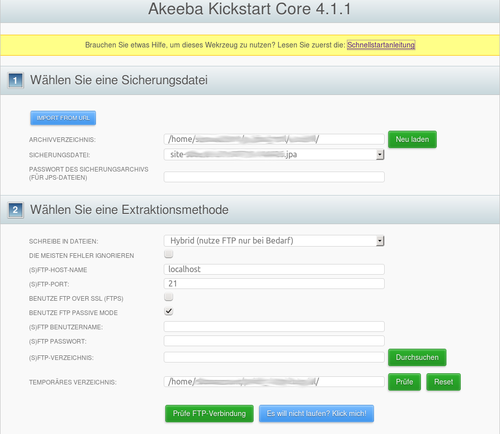 - Hier das Arbeitsverzeichnis und die passende JPA Datei auswählen, was durch Akeeba schon passiert sein sollte.