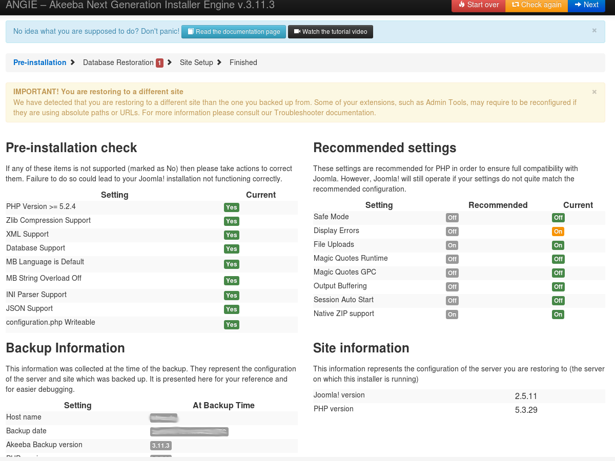 In dem neuen Fenster ("ANGIE") , das sich jetzt öffnet werden alle Daten des Backups und des Servers aufgelistet. In den meisten Fällen sollten alle Buttons grün sein. Ist der ein oder andere orange kann man das ignorieren, sollte aber für eine produktive Umgebung versuchen die Einstellung zu ändern. Bei einem roten Button muss man die Einstellungen des Hostings anpassen. Hierfür wäre im Zweifelsfall der Provider anzusprechen.