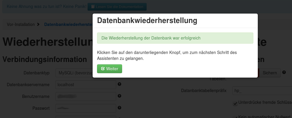 Sobald die Datenbank wiederhergestellt ist auf "Weiter" klicken.