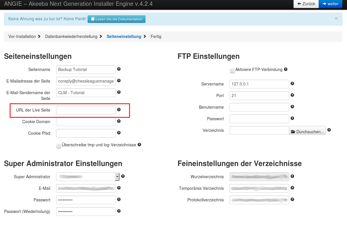 Bei den Seiteneinstellungen alle nötigen Angaben tätigen, insbesondere ein Passwort vergeben.