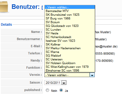 Sie müssen spätestens jetzt ihrem Benutzerkonto einen Verein zuweisen, da bestimmte Funktionen im CLM darauf angewiesen sind bzw. ihnen sonst kein Zutritt zu bestimmten Bereichen wie der Ligaverwaltung gewährt wird. Klicken Sie im Hauptmenü auf "Benutzer" und anschließend auf den z.Z. einzigen Benutzer des CLM. Ändern Sie ggf. den Namen und alle anderen Werte und geben Sie dem Benutzer einen Verein. Sie verlassen den Bereich durch abspeichern.