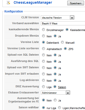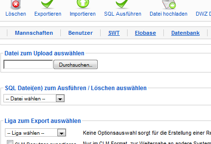 a) Verband festlegenDamit der CLM richtig funktioniert muß ein Verband (Bezirk- oder Landesverband) festgelegt werden. Wählen Sie unter "Verband auswählen" ihren Verband aus der Liste aus. b) Upload aktivierenEs ist ebenfalls nötig das Hochladen von SQL Dateien und deren Ausführung zu erlauben um später die DWZ-Datenbank in Betrieb nehmen zu können. Aktivieren Sie dazu die Bereiche "Upload von SQL Dateien" und "Ausführung des SQL". Nach der Installation der DWZ Daten sollten Sie diese Optionen wieder deaktivieren. |