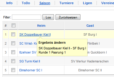 Wenn Sie sich noch im Rundenmanager befinden klicken Sie auf eine der Runden um in den Ergebnismanager zu gelangen (Ansonsten "Ligen" -> Liga anklicken -> Runde anklicken). Wenn Sie auf die Heimmannschaft einer der Paarungen klicken können Sie die Spielergebnisse eingeben. Wählen Sie mit den DropDown Menues Spieler und Ergebnisse und speichern Sie ab.