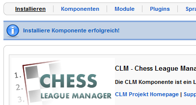 O) JoomlaWelche Joomla-Version 1.5, 1.7 oder 2.5 ist installiert? Ist diese funktionstüchtig? Wenn ja, dann können Sie mit der Installation der entsprechenden CLM-Version beginnen ! Sollte dies nicht der Fall sein, laden Sie sich Joomla herunter, im Web gibt es viele Angebote, z.B. www.jgerman.de, und installieren Sie es sich zuerst auf ihrem Server. Achtung: Im Downloadbereich unseres CLM-Projekts finden Sie die CLM Komponenten und Module sowohl für Joomla 1.5 als auch für Joomla 1.7 und 2.5