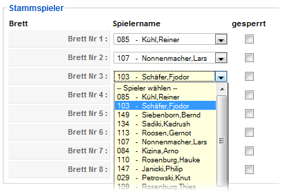 Der Mannschaft sind bisher keine Spieler zugeteilt worden, dies werden wir jetzt ändern. Machen Sie einen Haken vor einer Mannschaft der Sie einen Verein zugewiesen haben und drücken Sie den "Meldeliste bearbeiten" Knopf. Wählen Sie hier per DropDown Menue die Spieler der Mannschaft aus und speichern Sie ab. Wiederholen Sie diesen Schritt für jede Mannschaft. Sollte ihre Liga eine Mannschaft "Spielfrei" benötigen, z.B. wegen ungerader Anzahl der Mannschaften, müssen Sie diese entsprechend benennen. Machen Sie einen Haken vor der Mannschaft und drücken Sie den Knopf "Spielfrei setzen". Es ist jetzt nicht mehr möglich Ergebnisse für diese Mannschaft abzugeben ! Eine Mannschaft die in der laufenden Saison vom Spielbetrieb zurücktritt kann man so ebenfalls auf spielfrei setzen. |