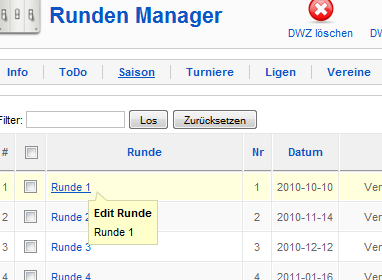 Damit bei den Runden auch die richtigen Daten angezeigt werden müssen diese bearbeitet werden. Klicken Sie im Hauptmenue auf "Ligen" und anschließend auf den Namen der von ihnen erstellten Liga. Sie befinden sich jetzt im Rundenmanager. Machen Sie einen Haken vor einer Runde und drücken Sie den "Bearbeiten" Knopf. Wählen Sie entsprechende Werte wie z.B. ein Datum aus und speichern Sie anschließend ab. Der Vorgang sollte mit jeder Runde wiederholt werden. |