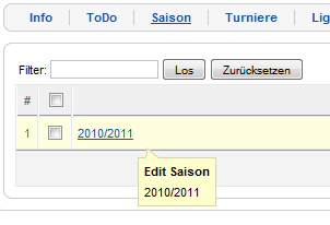 Wechseln Sie in den Hauptmenüpunkt "Saison" um die Einstellungen für die voreingestellte Saison anzupassen. Klicken Sie auf den Namen der Saison oder machen Sie einen Haken vor ihr und drücken den "Bearbeiten" Knopf. Ändern Sie den Namen der Saison auf einen der ihnen passend erscheind und speichern Sie ab.