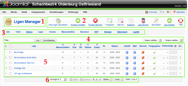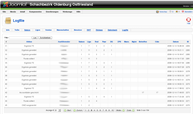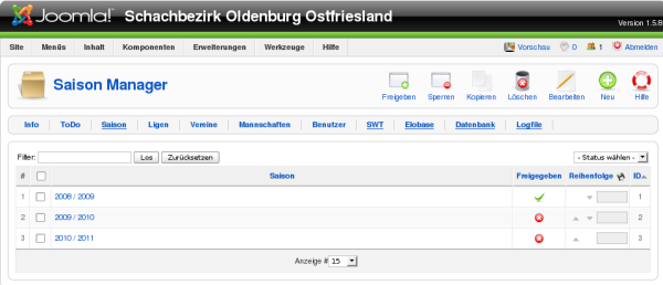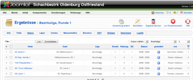 Sie können die Zahl der dargestellten Elemente pro Seite mit "Anzeige" beeinflußen. Bei jeden Einloggen in den CLM werden allerdings die globalen Vorgaben aus Joomla verwendet (meist 15 Elemente pro Seite).