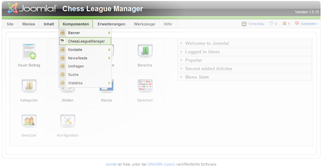 Der Administrationsbereich ( Das sog. Backend) ist die Schaltzentrale von Joomla. Hier können, je nach Berechtigung des Nutzers, verschiedene Aktionen wie z.B. die Installation einer Komponente, das Ändern der globalen Einstellungen oder das Schreiben eines Artikels durchgeführt werden. Bevor Sie den CLM verwenden sollten Sie sich mit den grundlegensten Joomla! Techniken vertraut machen, da ihnen dies einige Dinge erheblich vereinfachen wird. Insbesondere das Konzept der Bereiche und Kategorien wird für Sie wichtig, wenn Sie Joomla auch zur Gestaltung ihrer Webseite verwenden wollen.