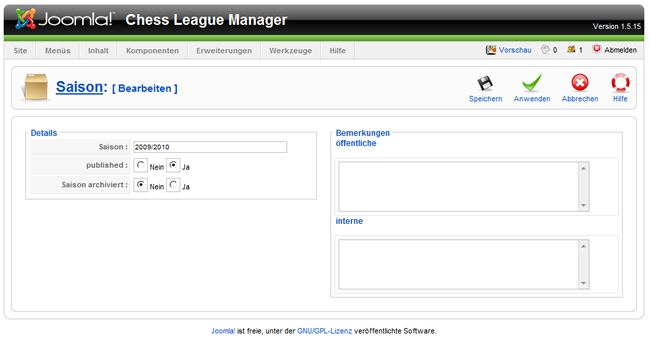 Hier haben wir wieder ein wichtiges Element, die Bemerkungen : Öffentliche Bemerkungen sind meistens an einer Stelle des Frontends für alle Nutzer der Seite zu sehen, während die internen Bemerkungen auch nur für die Administratoren und Staffelleiter gedacht sind.