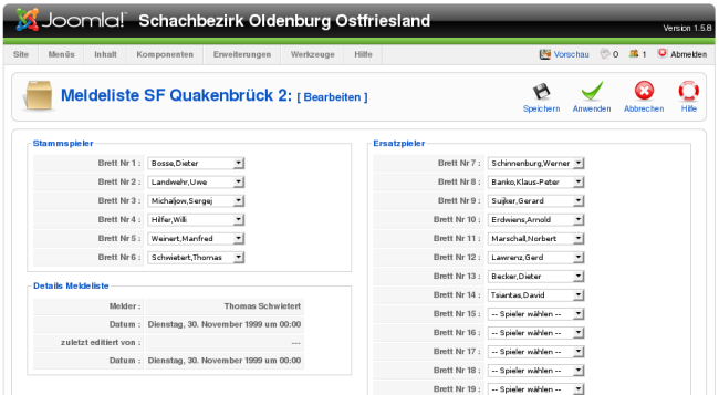 Wenn die Meldelisten per Frontend Abgegeben wurden können Sie sie bearbeiten, ansonsten ist natürlich auch eine Erstellung möglich. Die Ansicht ist nach Stamm- und Ersatzspielern unterteilt und es gibt einen Bereich der die Daten der Abgabe und Bearbeitung zeigt.